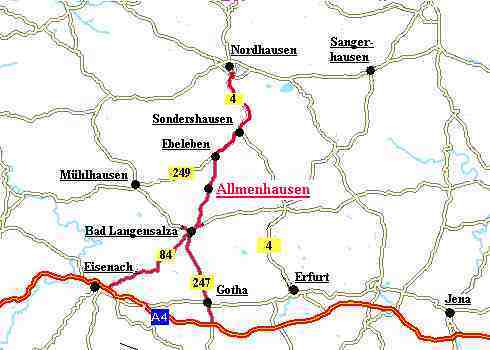 Aus Richtung Nordhausen In Nordhausen die B4 Richtung Sondershausen; In Sondershausen immer Richtung Erfurt; Die B 249 Richtung Ebeleben/Mühlhausen; In Ebeleben die B 84 Richtung Eisenach; In Allmenhausen den Hinweisschildern folgen.
